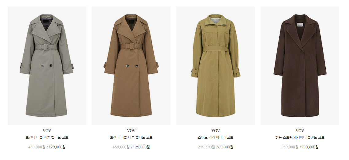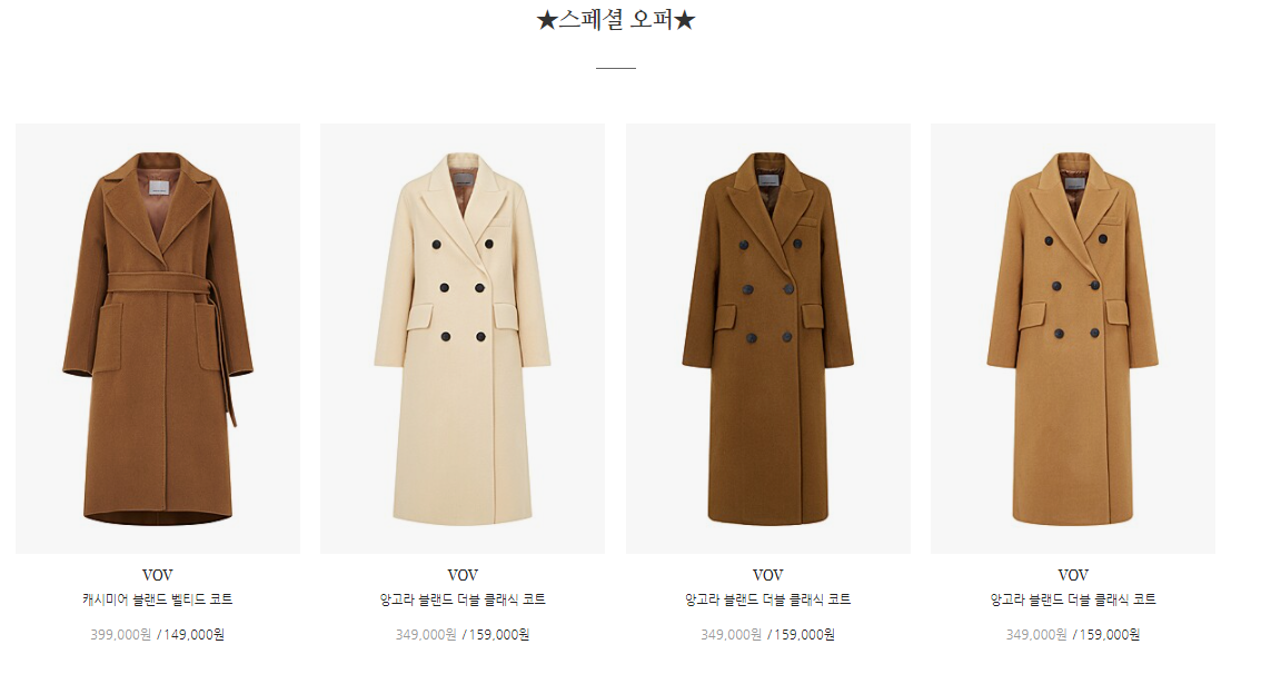 아우터는 정말 눈에 튀는 것들만 좋아하는 유니크 매니아층만 아니라면 무난하게 오래 입을 수 있는 것들로 선택하는 게 제일인 것 같아요. 먼저 보브 코트 스페셜 오퍼 라인을 보시면 더블 버튼으로 되어있는 디자인도 많고, 벨티드도 다양한 스타일로 준비되어 있습니다. 소재는 캐시미어부터 앙고라 블랜드, 퍼 등 여러 가지로 구비되어 있고요. 가격대가 거의 절반, 그 이상으로 내려가는 것들도 있어서 지금 이용하면 내년에 코트 걱정은 하지 않아도 될 것 같아요.